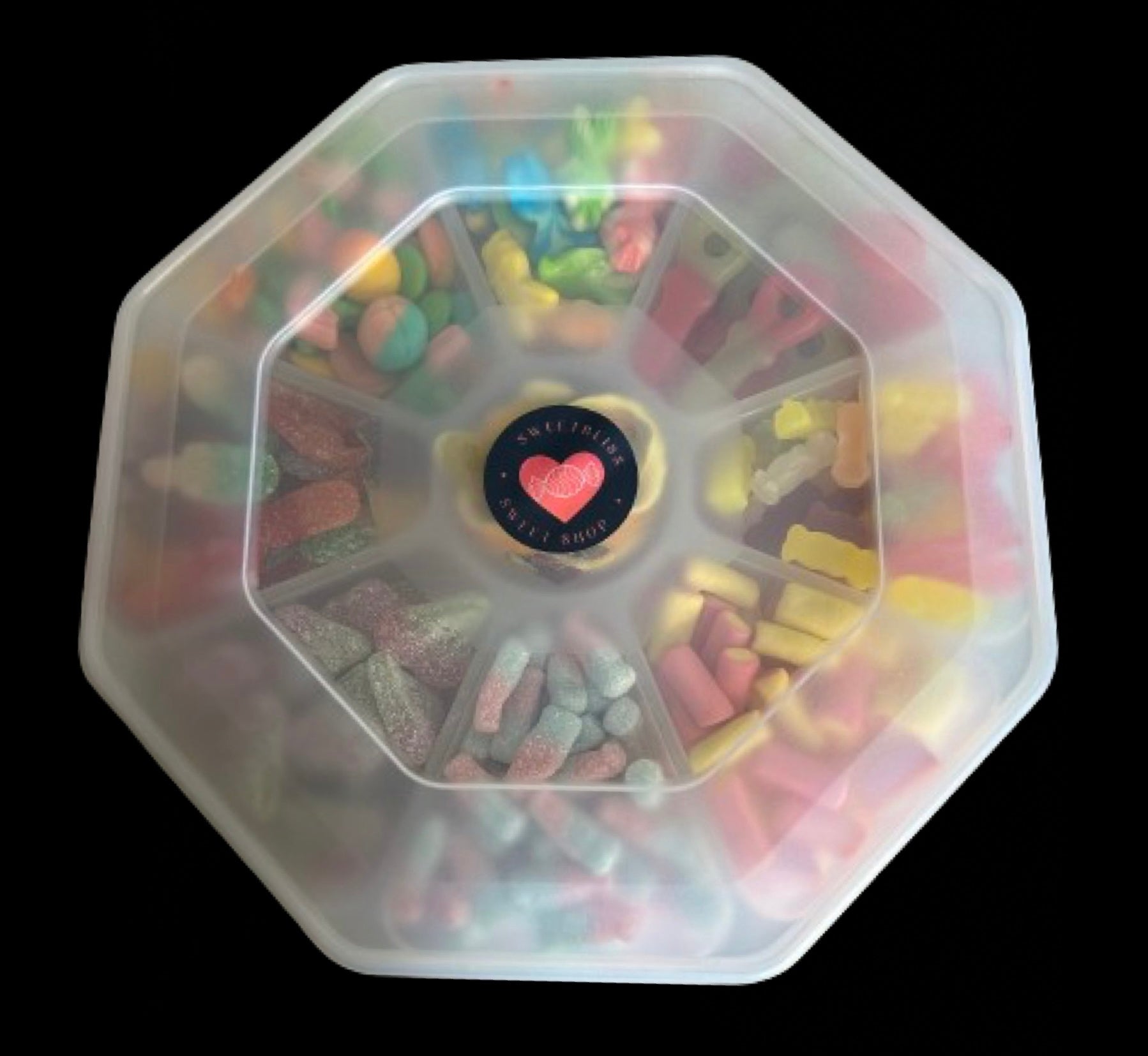 Indulge in a Christmas Sweet Platter filled with your Christmas themed pick n mix candies with this 9 section platter! Perfect for sharing, this platter can hold up to 1.5kg of candy goodness!